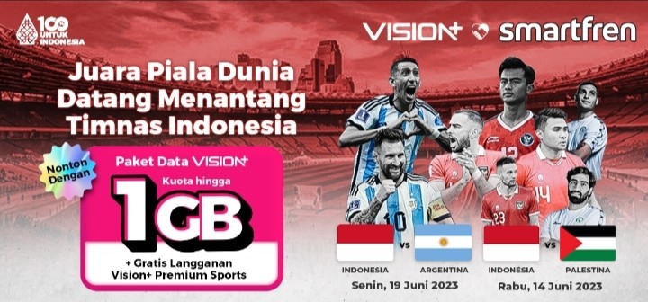Ia menjelaskan, pertandingan persahabatan Indonesia dengan Argentina berlangsung pada Senin, 19 Juni 2023, mulai dari jam 19.00. Untuk mendapatkan Paket data Smartfren Vision+ ini, pelanggan bisa menggunakan aplikasi MySmartfren atau melalui USSI *123*7*6#; kemudian download aplikasi Vision+, dan pastikan registrasi menggunakan nomor Smartfren.