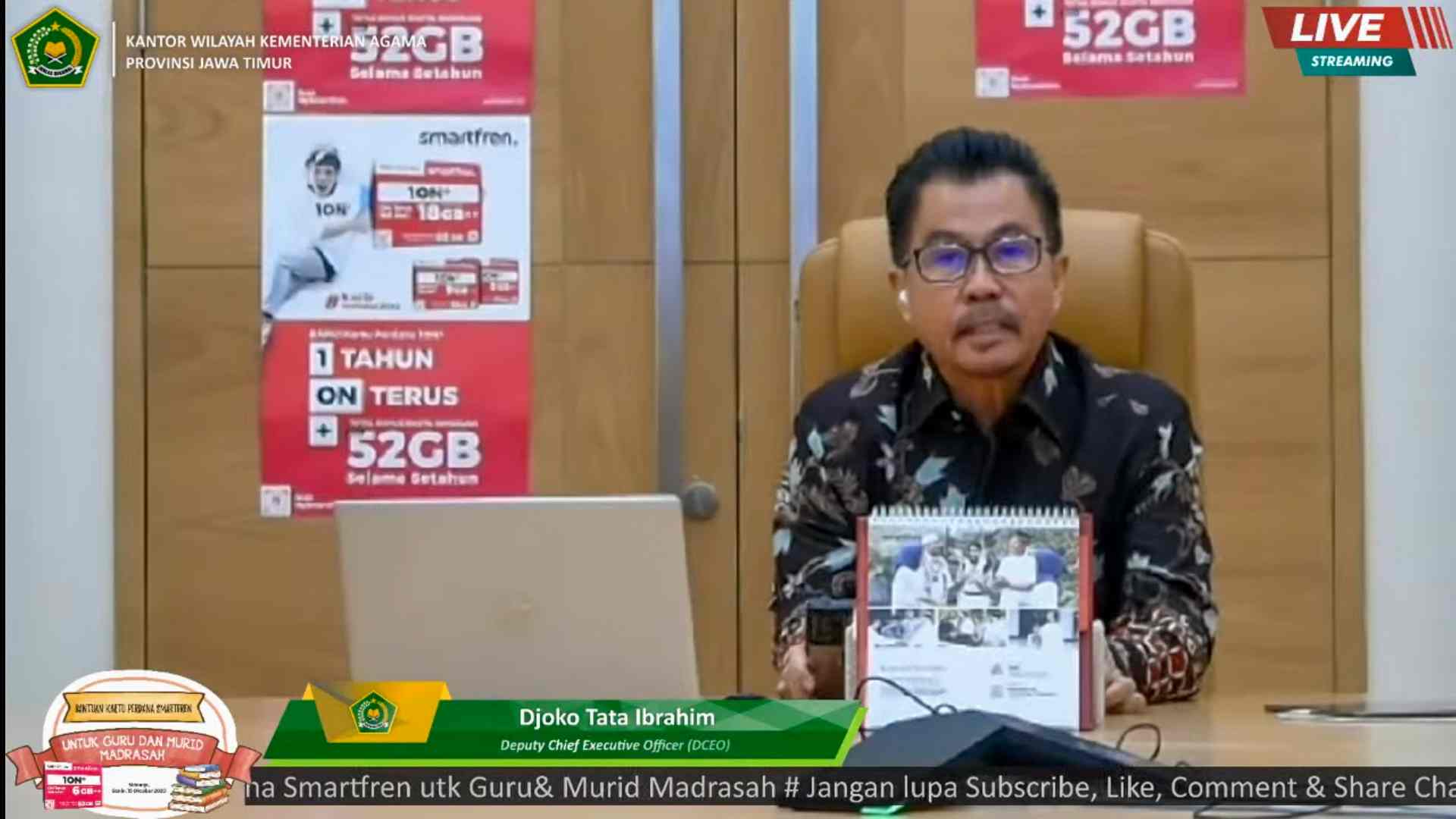 ” Selain itu, kartu perdana gratis ini kami berikan untuk seluruh peserta didik di madrasah di Jawa Timur dengan harapan dapat membantu terlaksananya kegiatan belajar jarak jauh bagi para siswa dan guru. Semoga dukungan Smartfren bisa turut menjaga semangat para siswa dan guru madrasah untuk menggapai berbagai peluang masa depan,” imbuh Djoko Tata Ibrahim.