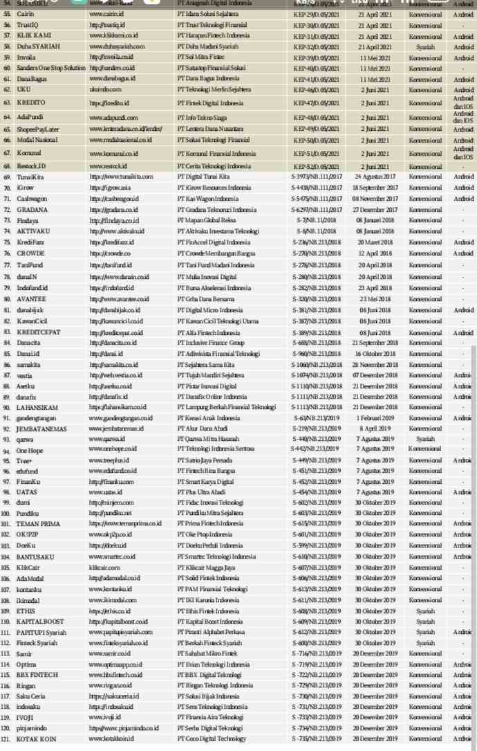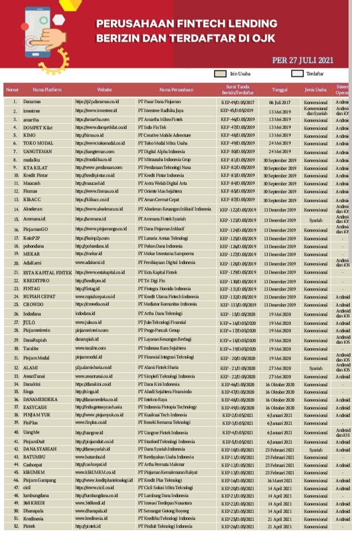 SURABAYA : ( KABARAKTUALITA.COM ) – Sampai dengan 27 Juli 2021, total jumlah penyelenggara fintech peer-to-peer lending atau fintech lending yang terdaftar dan berizin di OJK adalah sebanyak 121 perusahaan.