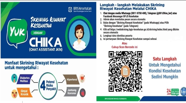 “Ada 47 pertanyaan tentang kebiasaan dan aktivitas sehari-hari, penyakit yang pernah diidap, riwayat penyakit dalam keluarga peserta, dan pola makan yang harus diisi. Berdasarkan pengisian pertanyaan ini, maka peserta JKN – KIS akan mendapatkan hasil pengecekan risiko penyakit yang mungkin diderita meliputi diabetes, hipertensi, jantung, dan ginjal,” ungkap Eka.