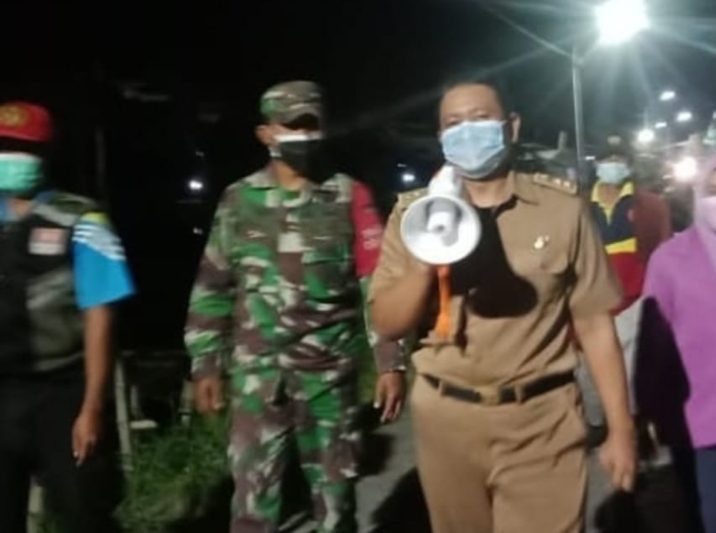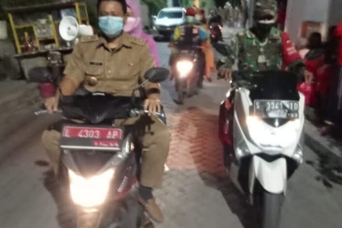 Tidak hanya siang hari, Mantan Sekretaris Kelurahan Bangkingan ini juga melakukan sosialisasi Prokes kepada warganya pada malam hari.